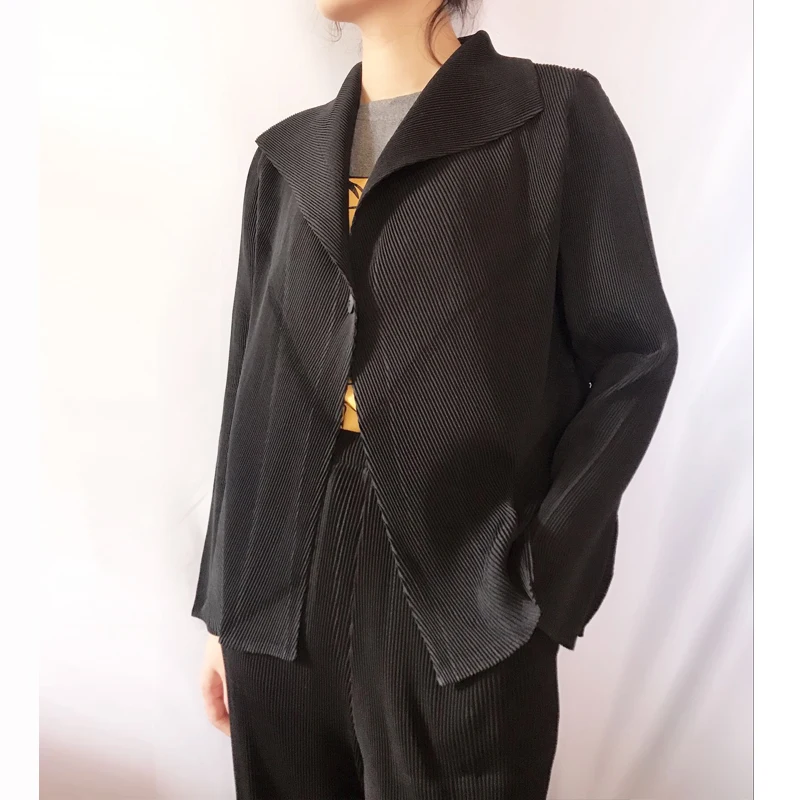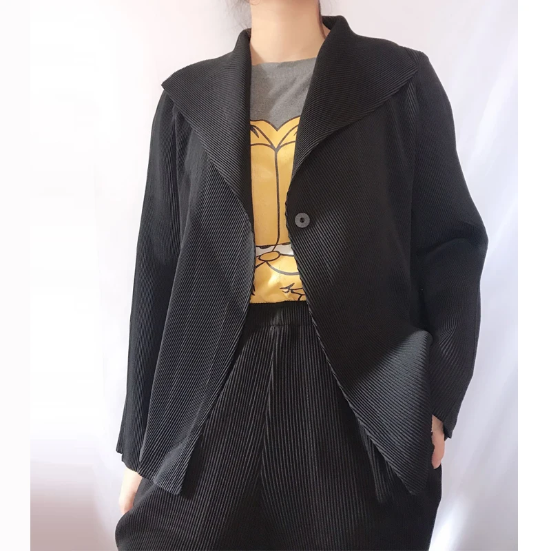 Hot Sale MIYAKE Folded Autumn New Pure Colour Large Size One Button Fashion Ladder Long Sleeve Coat free shi