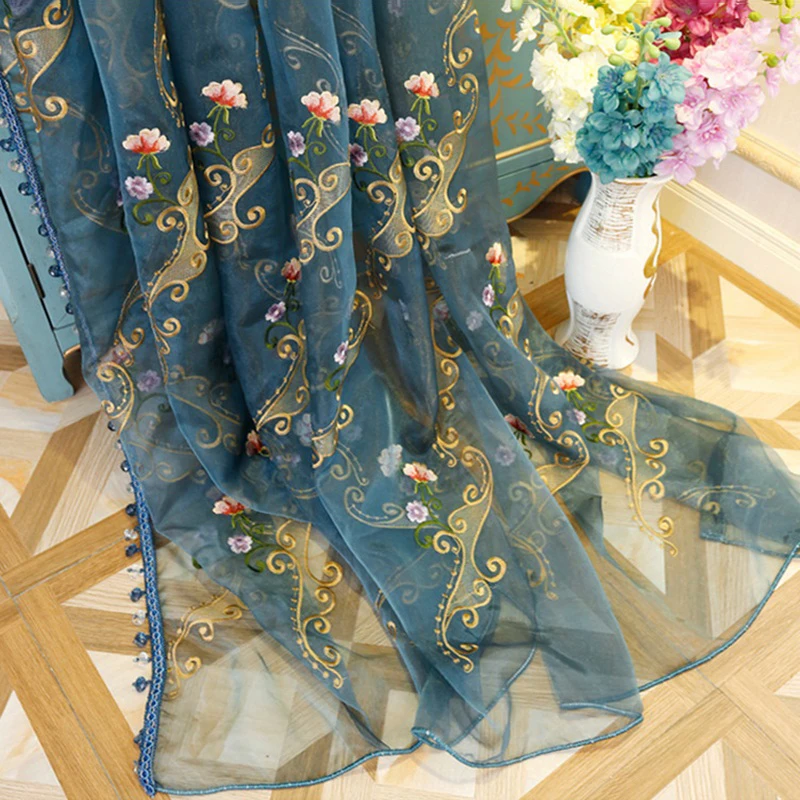 European Blue Embroidered Voile Curtains Bedroom Sheer Curtains for Living Room Tulle Window Curtai