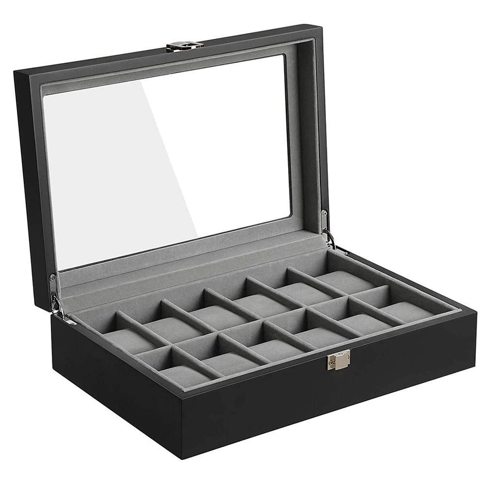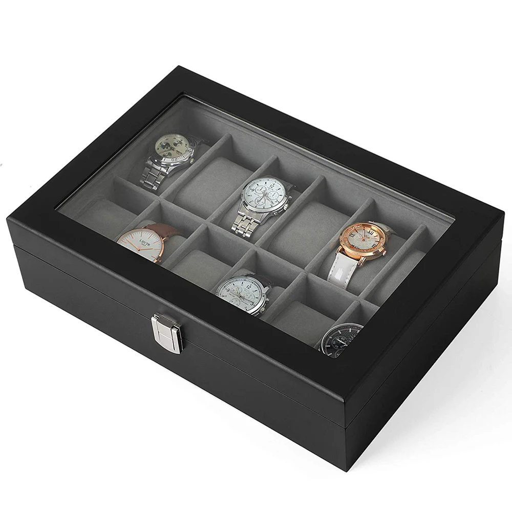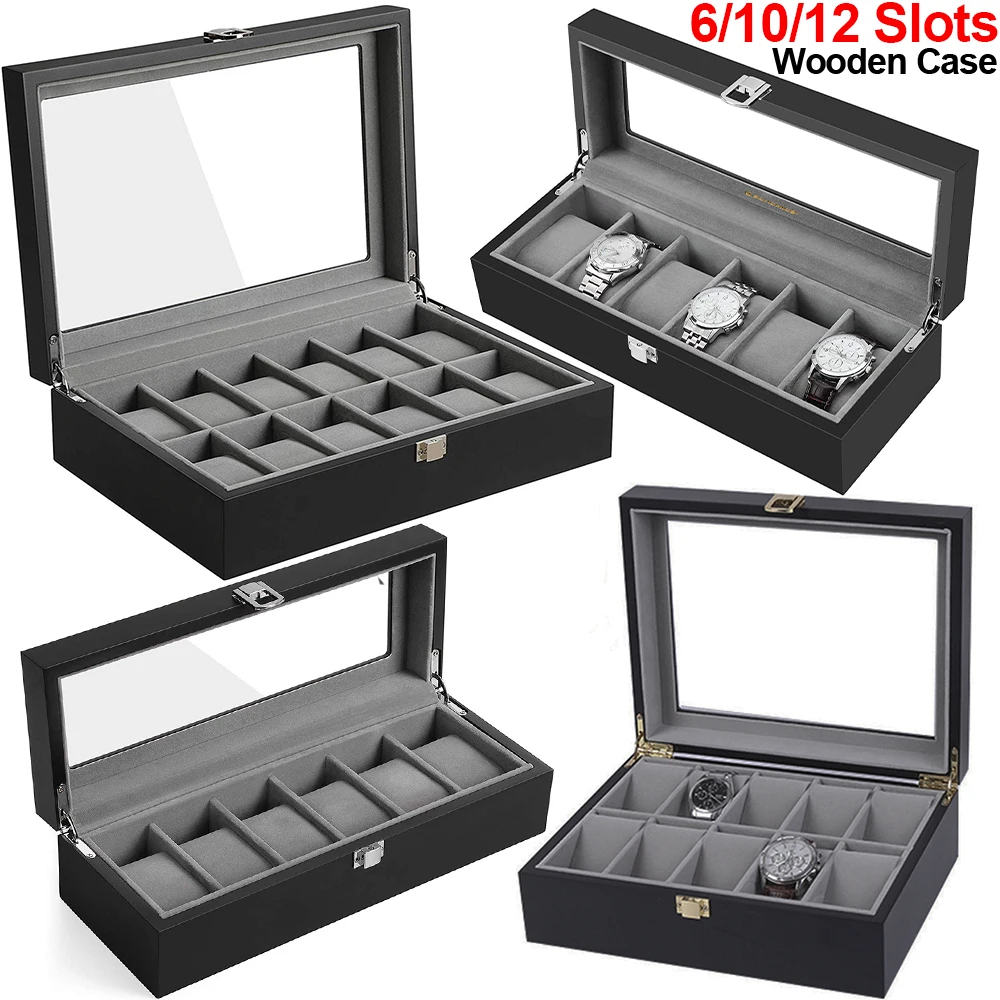 6/10/12 Slots Watch Box Black Wooden Luxury Watch Case Watch Display Strage Organizer Glass Top Wat